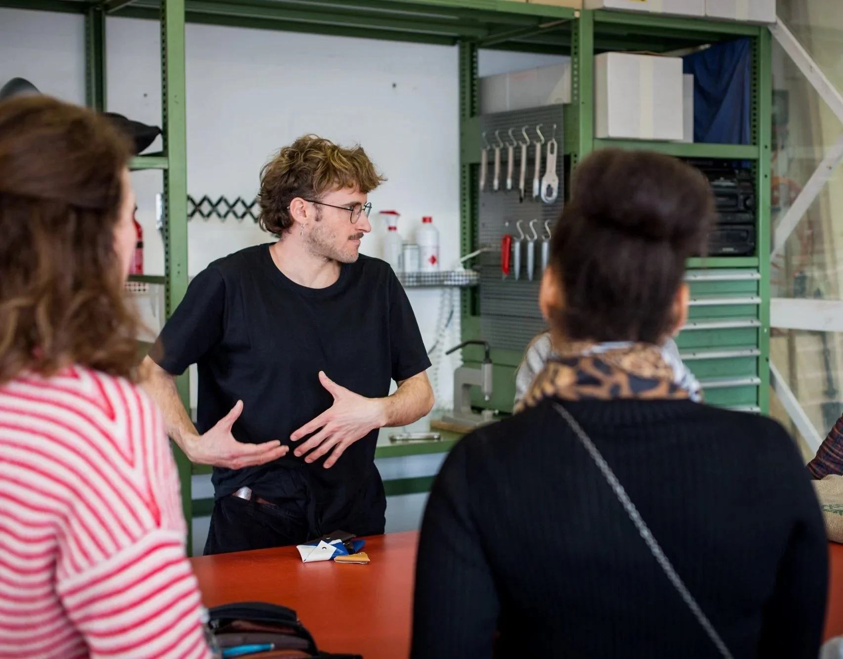 We use various offcut and used materials: PVC tarp from damaged bouncy castles, scaffolding wrap from construction sites, or scrap leather from upholsterers and saddleries.