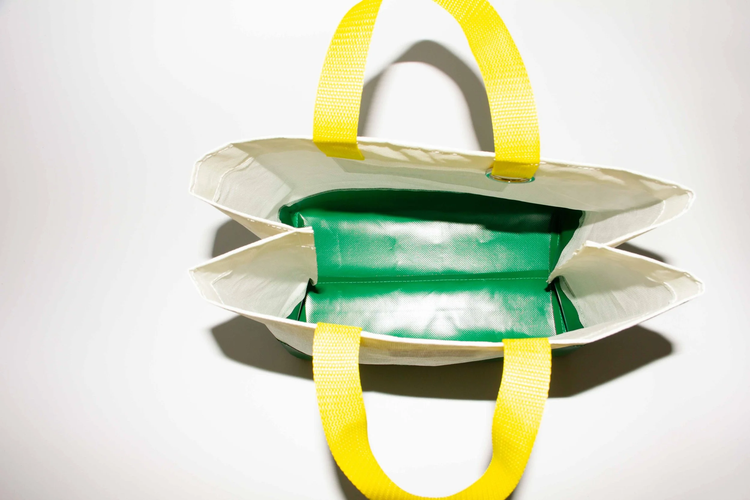 Eddie picked the colours for each element, and the bags were assembled from various used PVC tarps. They’re finished with a bold label reading “EDDIE’S BAG”.